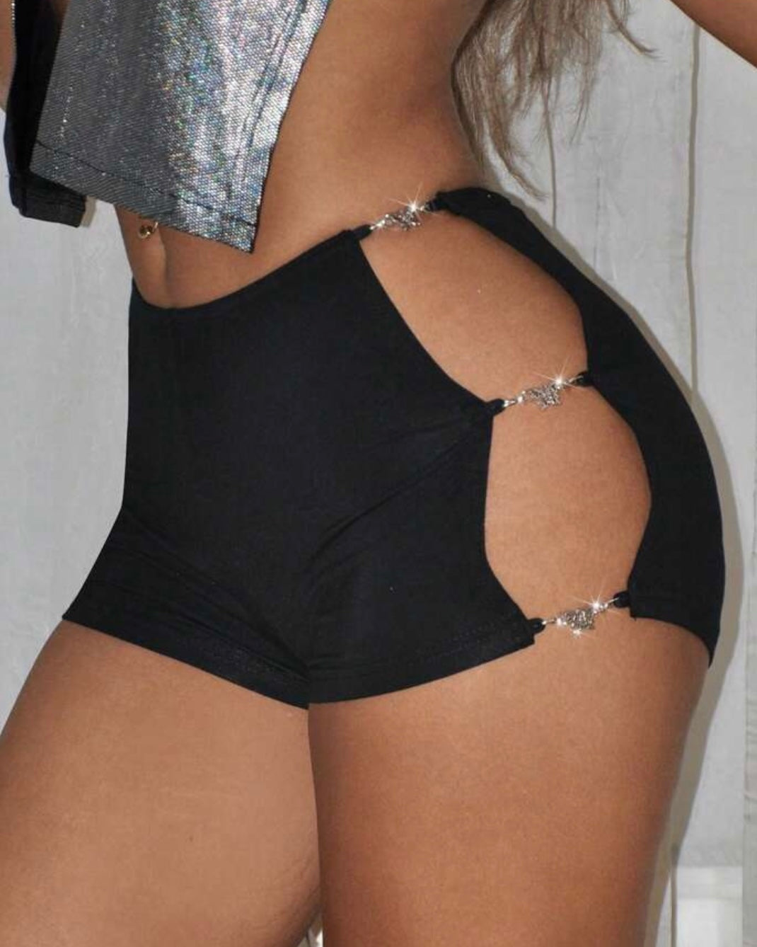 Un capo che celebra la femminilità audace. Questi shorts a vita alta accarezzano le curve con la morbidezza del nero intenso, mentre i tagli laterali lasciano intravedere la pelle in un gioco sensuale e intrigante. I dettagli gioiello scintillanti trasformano ogni passo in una dichiarazione di potere e fascino. Indossarli significa dominare la scena con eleganza e desiderio. ✨